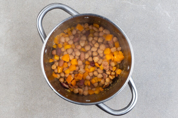 Die Bohnen in einem Sieb abtropfen lassen. Mit der Paprika in einem mittelgroßen Topf mit 1EL Pflanzenöl und 1 Prise Salz bei starker Hitze ca. 10Min. braten, bis die Bohnen leicht aufplatzen und die Paprika weich ist.