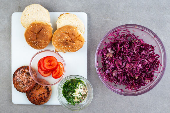 So ein herzhafter, veganer Burger kann schon was. Vor allem, wenn die Burgerpattys mit Senf aromatisch gewürzt und nebst fruchtig-frischer Tomatenscheibe mit einem selbst gemachten Ranchdressing im lecker-knusprigen Brötchen serviert werden. Nicht weniger spektakulär: der zitronig-frische und herrlich knackige Rotkohlsalat mit Sellerie, der zum Burger gereicht wird.
