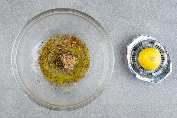 Die Zitrone halbieren und auspressen. 1–2EL Zitronensaft mit 1EL Olivenöl, ca. 1/3 des Senfs, der Gewürzmischung und je 1 kräftigen Prise Salz und Pfeffer verrühren.