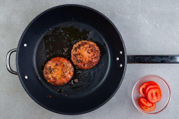 Die Pattys in einer mittelgroßen Pfanne mit 1–2TL Pflanzenöl bei mittlerer bis niedriger Hitze auf jeder Seite ca. 8Min. braten. Inzwischen die Tomate in dünne Scheiben schneiden.