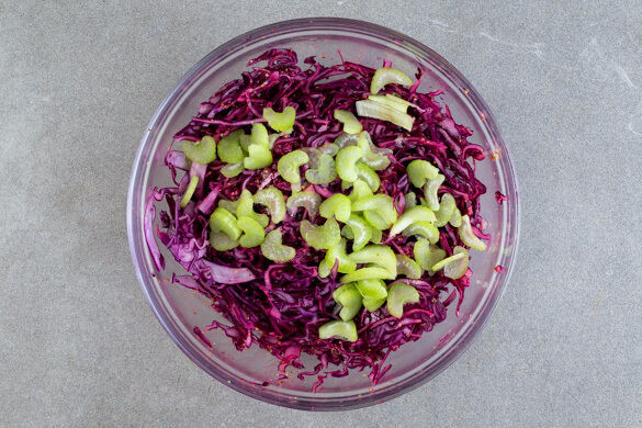 Den Rotkohl vierteln und in möglichst dünne Streifen schneiden, dabei den Strunk entfernen. Den Sellerie in dünne Scheiben schneiden. Alles gut mit dem Dressing vermengen und den Salat zum Ziehen beiseitestellen.