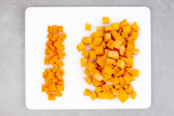 Die Süßkartoffel schälen und in ca. 1cm große Würfel schneiden. Die Karotte ggf. schälen und in kleine Würfel schneiden.