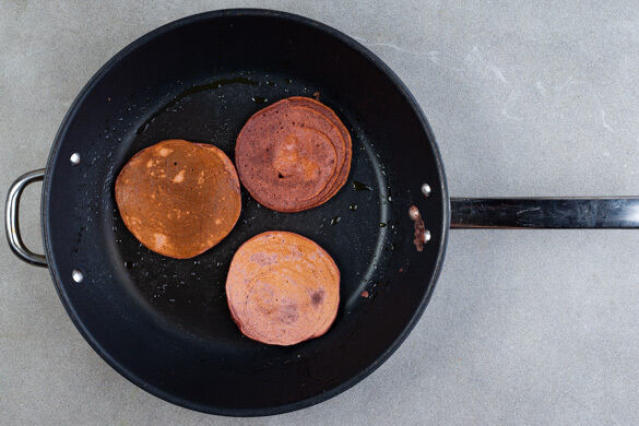 Die Eier verquirlen, dann die Rote-Bete-Milch unterrühren. Die Flüssigkeit mit der Mehlmischung verrühren. Es ist nicht schlimm, wenn der Teig noch ein paar kleine Klümpchen hat.