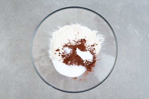 Das Mehl mit 2TL Backpulver, dem Kakaopulver, 3EL Zucker und 1/2TL Salz verrühren.