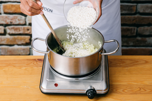 Die Zwiebeln in einem mittelgroßen Topf mit 1EL Olivenöl bei mittlerer Hitze ca. 1Min. glasig anschwitzen. Den Reis hinzufügen und ca. 1Min. anrösten.