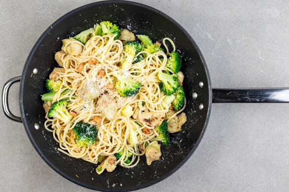 Die Urversion der Pasta „Cacio e pepe“ beschränkt sich aufs ganz Wesentliche: Pasta, würziger Hartkäse – „cacio“ – und Pfeffer – seines Zeichens „pepe“. Wir haben den aromatischen Formenschatz etwas erweitert und sorgen mit geräuchertem Hähnchen, Artischocken und frischem Brokkoli für ein wenig Aufregung in der cremigen Gemütlichkeit. Aber so fix, wie dieses Gericht auf dem Tisch steht, bleiben wir ohnehin ganz entspannt ...