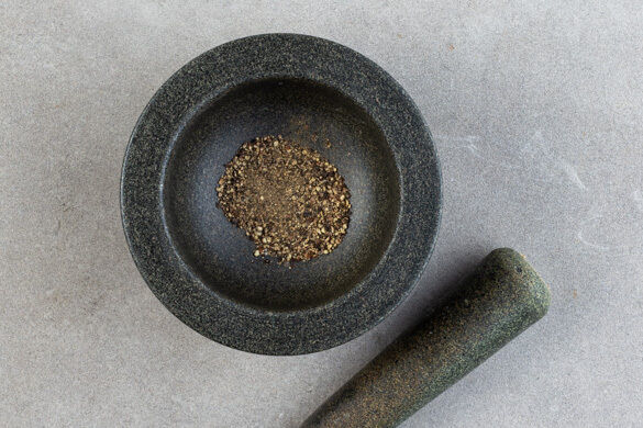 Die Pfefferkörner in einem Mörser fein zerstoßen. Tipp: Wer keinen Mörser hat, kann den Pfeffer auch z. B. in einen Gefrierbeutel geben und mit einer schweren Pfanne zerstoßen. Ca. 3/4 des Pfeffers in die Pfanne geben und mit dem Fleisch und den Artischocken vermengen.