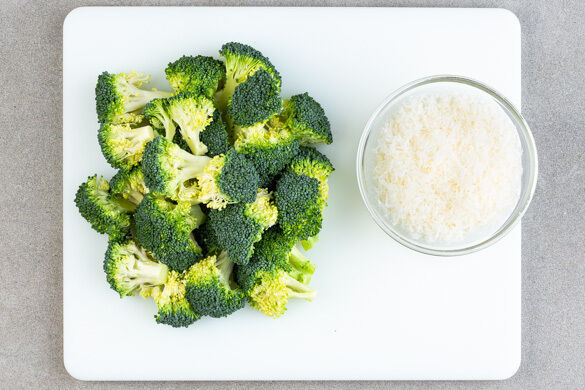 In einem mittelgroßen Topf ausreichend gesalzenes Wasser für die Pasta und den Brokkoli zum Kochen bringen. Den Brokkoli in mundgerechte Stücke schneiden. Den Käse fein reiben.