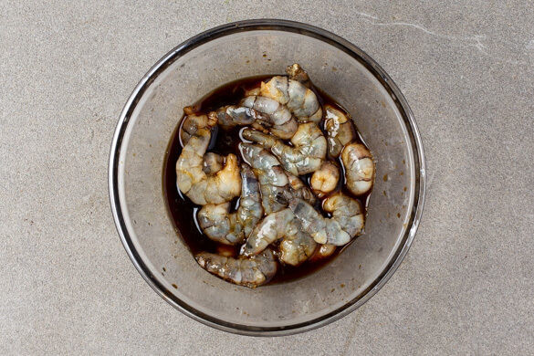 Die Garnelen in einem Sieb kalt abspülen und abtropfen lassen. Die Limette halbieren und auspressen. Den Limettensaft mit der Sojasauce und 1 Prise Salz verrühren und die Garnelen untermengen.