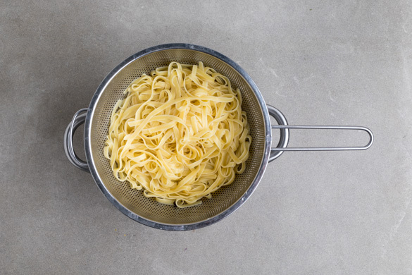 Die Pasta in das kochende Wasser geben und in 7–9Min. bissfest kochen. Mit einer Tasse etwas Kochwasser abschöpfen, dann die Pasta in ein Sieb abgießen und abtropfen lassen.