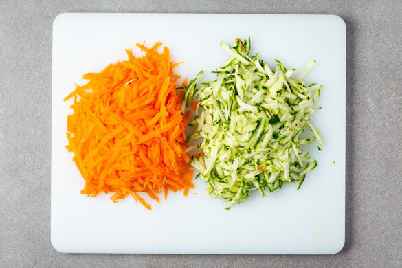 Die Karotten ggf. schälen und mit einer Küchenreibe grob raspeln. Die Zucchini ebenfalls grob reiben.