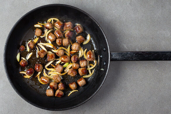 Die Würste in ca. 1cm große Stücke schneiden und mit den übrigen Zwiebeln in einer zweiten Pfanne mit 1–2EL Olivenöl bei mittlerer bis starker Hitze 4–6Min. goldbraun anbraten.