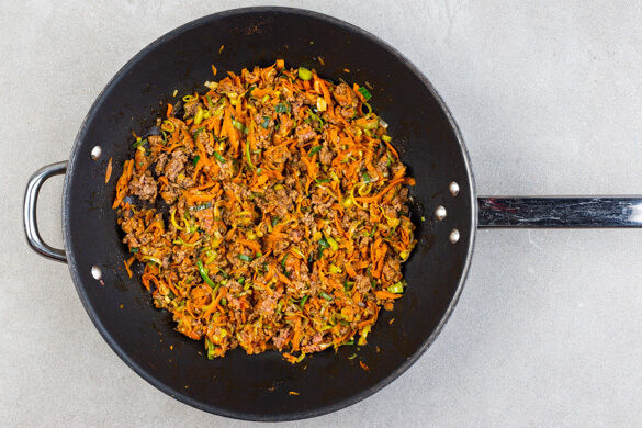 Die Karotten und den Lauch in einer großen Pfanne mit 1–2EL Pflanzenöl bei mittlerer bis starker Hitze ca. 3Min. anbraten.
