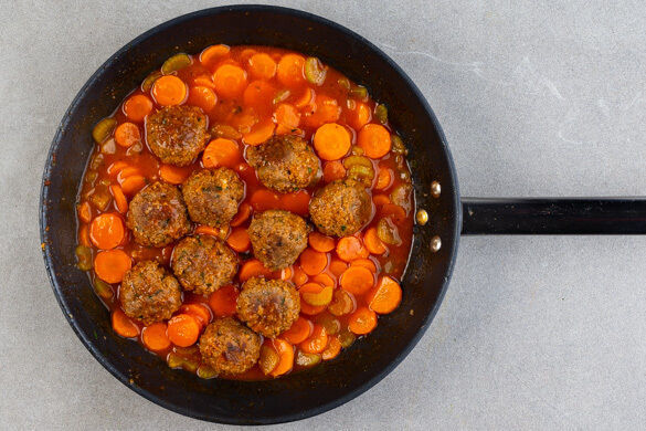 Die Hackbällchen, die 1/2 des Knoblauchs, die Karotten und den Sellerie in einer großen Pfanne mit 1EL Öl bei mittlerer Hitze 3–4Min. anbraten, bis die Hackbällchen rundum gebräunt sind. Die 1/2 des Tomatenmarks und 200ml Wasser dazugeben und die Sauce abgedeckt 5Min. köcheln lassen. Dann weitere 5Min. ohne Deckel leicht eindicken lassen. Mit Salz und Pfeffer würzen.
