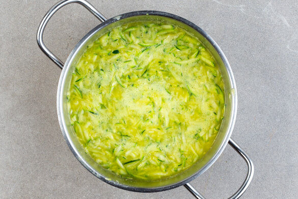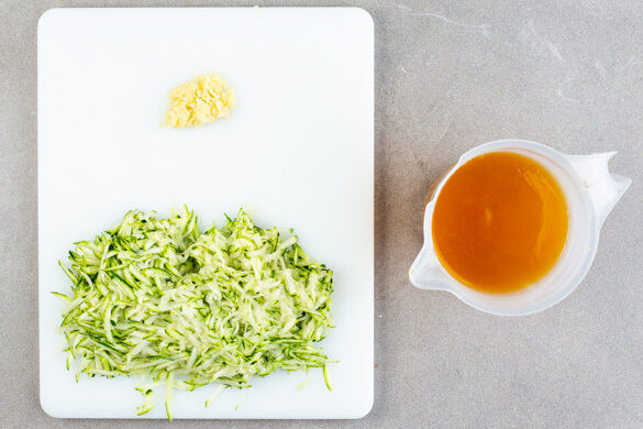 Die Zucchini mit einer Küchenreibe grob raspeln. Den Knoblauch schälen und fein würfeln. Das Brühgewürz und den Safran in 800ml heißes Wasser einrühren.