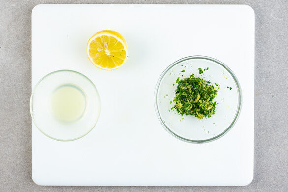 Die Zitronenschale abreiben und mit der Petersilie und dem restlichen Knoblauch mischen. 1 Zitronenhälfte auspressen. Den Käse fein reiben und mit 1EL Zitronensaft in das Risotto rühren. Nach Geschmack mit Salz und Pfeffer sowie ggf. mehr Zitronensaft würzen. Die Hackbällchen auf dem Risotto anrichten, mit der Gremolata garnieren und servieren.