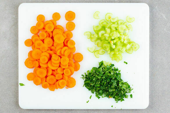 Die Karotten ggf. schälen und in dünne Scheiben schneiden. Den Sellerie ebenfalls in dünne Scheiben schneiden. Die Petersilie samt Stängeln fein hacken.