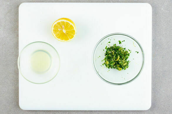 Die Zitronenschale abreiben und mit der Petersilie und dem restlichen Knoblauch mischen. Die Zitrone halbieren und auspressen. Den Käse fein reiben und mit 1EL Zitronensaft in das Risotto rühren. Nach Geschmack mit Salz und Pfeffer sowie ggf. mehr Zitronensaft würzen. Die Hackbällchen auf dem Risotto anrichten, mit der Gremolata garnieren und servieren.