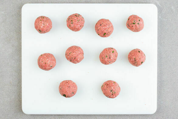 Das Hackfleisch mit der 1/2 der Petersilie, den Semmelbröseln und je 1/2TL Salz und Pfeffer vermengen, dann zu 16–20 walnussgroßen Hackbällchen formen.