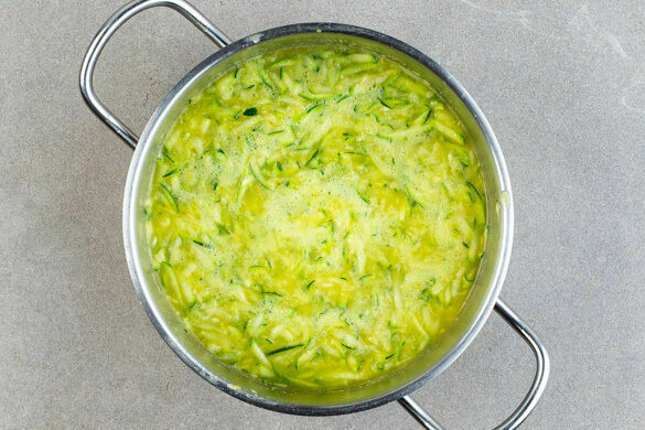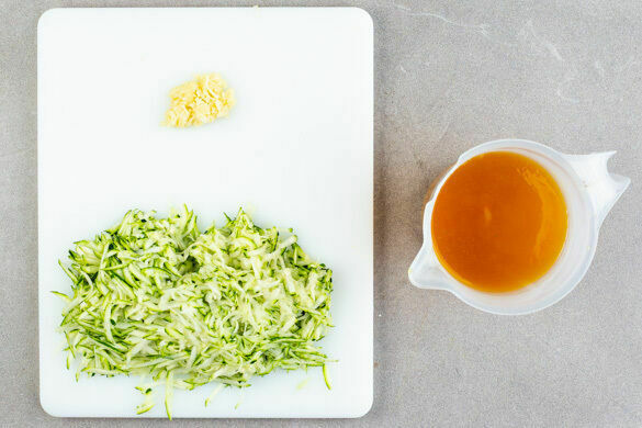 Die Zucchini mit einer Küchenreibe grob raspeln. Den Knoblauch schälen und fein würfeln. Das Brühgewürz und den Safran in 1,5L heißes Wasser einrühren.