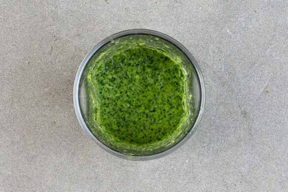 Den Backofen auf 200°C (180°C Umluft) vorheizen. Den Knoblauch schälen und fein würfeln. Die Rosmarinnadeln von den Stängeln zupfen und mit den übrigen Kräutern, dem Knoblauch, 2EL Olivenöl, 2EL Essig, 1EL Wasser, je 1 kräftigen Prise Salz und Pfeffer und 1 kleinen Prise Zucker in einem hohen Gefäß möglichst glatt pürieren.