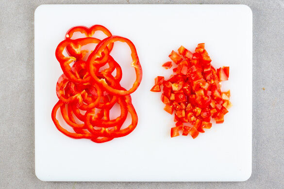 Die Paprika quer in dünne Ringe schneiden, dabei die Kerne entfernen. Die Tomate klein würfeln.