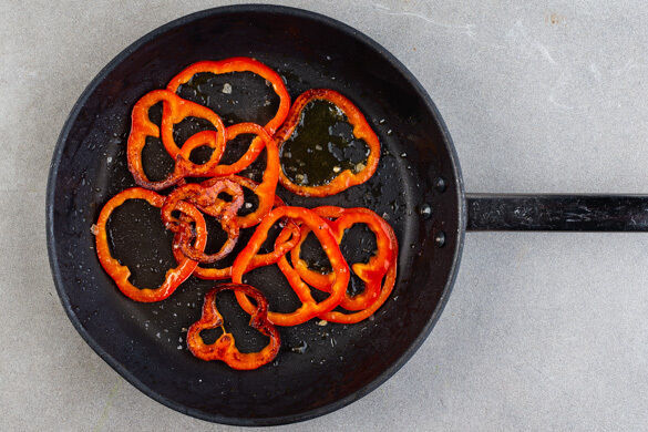 Die Paprikaringe in einer mittelgroßen Pfanne mit 1EL Olivenöl bei starker Hitze 3–4Min. braten, bis sie weich ist und einige Röstspuren aufweist. Dabei gelegentlich wenden. Mit je 1 Prise Salz und Pfeffer würzen und aus der Pfanne nehmen.