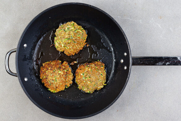 Aus je 2EL Teig mit den Händen eine Kugel und diese dann zu einem flachen Bratling formen. So lange wiederholen, bis der Teig verbraucht ist. Die Bratlinge in zwei großen Pfannen mit je 1EL Olivenöl 2–3Min. pro Seite braten, wenden, mit einem Pfannenwender flach drücken und weitere 2–3Min. braten, bis sie knusprig und gar sind. Bei Bedarf mehr Öl in die Pfanne geben.