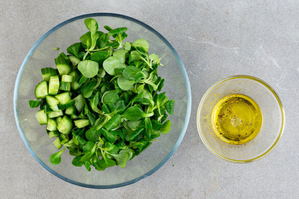 Den Salat mit der Gurke, 1–2TL Olivenöl, 1–2TL Essig und je 1 Prise Salz und Pfeffer vermengen. Den Feta über dem Salat zerkrümeln und den Koriander darüberstreuen. Die Bratlinge mit dem Salat und dem Dip anrichten und servieren.