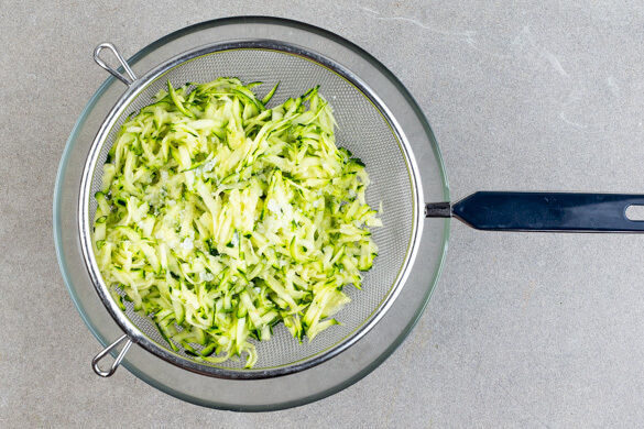 Die Zucchini auf der groben Seite einer Küchenreibe raspeln und in einem Sieb mit 1 kräftigen Prise Salz vermengen. Für ein paar Minuten stehen lassen und dann mit den Händen oder in einem Geschirrtuch möglichst viel Flüssigkeit herausdrücken.