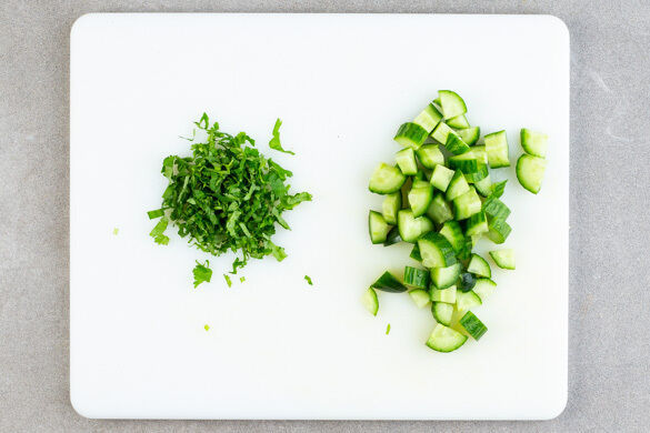 Die Gurke in mundgerechte Würfel schneiden. Den Koriander samt Stängeln fein schneiden.