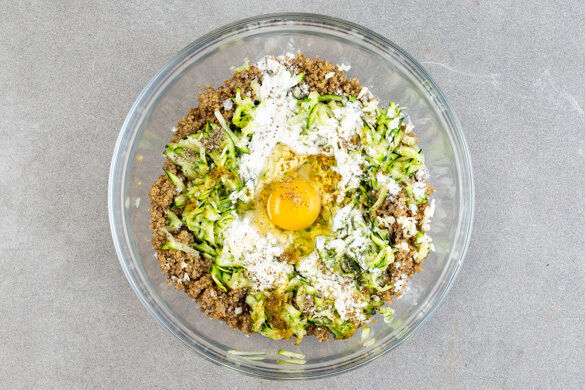 Den Knoblauch schälen, fein würfeln und mit der Zucchini, der Quinoa, 1 Ei, der 1/2 des Kreuzkümmels, 4EL Mehl und je 1/2TL Salz und Pfeffer vermengen.