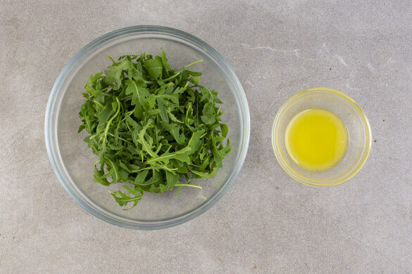 Den Rucola mit 1–2TL Olivenöl, 1TL Essig und je 1 Prise Salz und Pfeffer vermengen.
