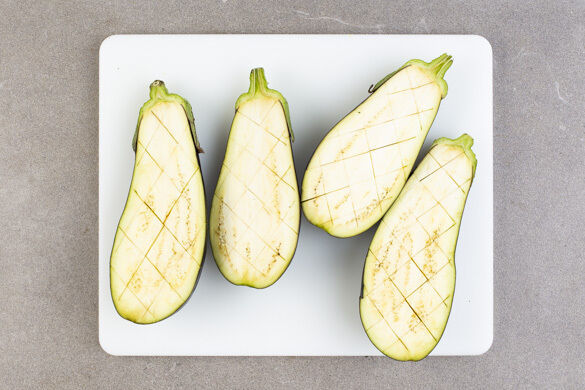 Den Backofen auf 250°C (230°C Umluft) vorheizen (ggf. die Grillfunktion nutzen). Die Auberginen längs halbieren und in jede Hälfte ein ca. 1,5cm tiefes, rautenförmiges Muster einschneiden.Die Auberginen mit der Schnittseite nach oben auf ein mit Backpapier ausgelegtes Backblech legen, mit etwas Olivenöl bepinseln und mit 1 Prise Salz bestreuen. Die Auberginen ca. 15 Min. im Ofen rösten