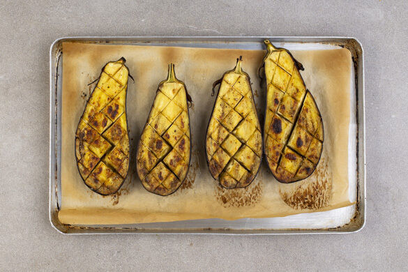 Nach 15 Min. die Auberginen wenden und weitere 10–15Min. im Ofen rösten, bis das Fruchtfleisch goldbraun und weich ist. Die Auberginen im ausgeschalteten Ofen warm halten.