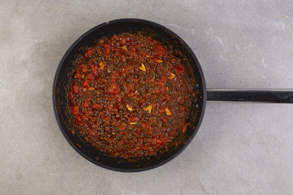 Die Linsen in einem Sieb mit kaltem Wasser abspülen. In einer mittelgroßen Pfanne die Zwiebel und den Knoblauch mit 1EL Olivenöl für 2–3Min. anschwitzen. Die Linsen mit der Gewürzmischung dazugeben und unter Rühren 1Min. braten. Die gehackten Tomaten hinzufügen, bei mittlerer Hitze weitere 8–10Min. köcheln lassen und nach Geschmack mit Salz und Pfeffer würzen.