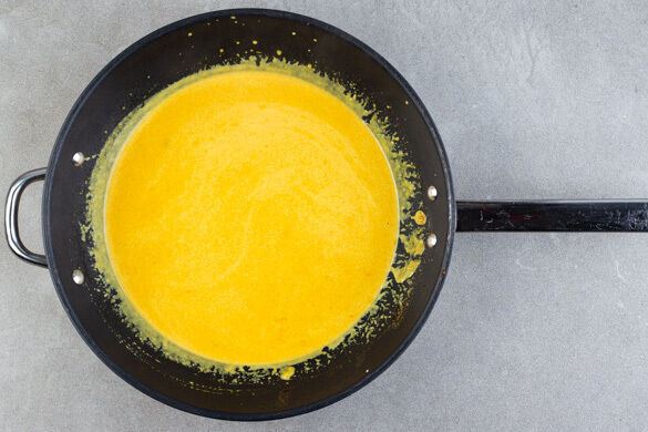 In einer mittelgroßen Pfanne 40g vegane Margarine bei mittlerer Hitze schmelzen. Die Currypaste im heißen Fett 30Sek.–1Min. unter Rühren anbraten, dann mit der Kokosmilch und 50ml Wasser ablöschen und die Sauce bei mittlerer bis niedriger Hitze 4–6Min. sanft einköcheln lassen.