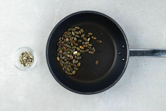 Die Kürbiskerne in einer kleinen Pfanne ohne Zugabe von Fett bei mittlerer Hitze ca. 2Min. anrösten, bis die Kürbiskerne leicht gebräunt sind. Vorsicht, sie können schnell verbrennen. Zum Abkühlen aus der Pfanne nehmen. 1EL Kürbiskerne fein hacken.
