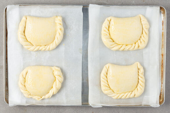Den Teig mit dem Papier nach unten ausrollen und in 4 Rechtecke schneiden. Etwa 2EL Füllung jeweils auf einer Hälfte des Rechtecks verteilen, dann die andere Hälfte darüberklappen. Die Ränder entweder dekorativ zusammenfalten oder mit einer Gabel fest verschließen und die Rechtecke zu halbmondförmigen Empanadas formen.