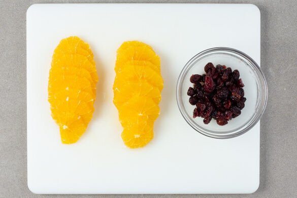 In der Zwischenzeit die Orange mit einem Messer so schälen, dass auch die weiße Haut entfernt wird. Dann das Fruchtfleisch in dünne Scheiben schneiden und evtl. vorhandene Kerne entfernen. Die Cranberrys durch ein Sieb abgießen.