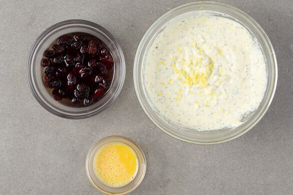 Den Backofen auf 220°C (200°C Umluft) vorheizen. Die Cranberrys in warmem Wasser einweichen. Die Zitronenschale fein abreiben. Die Eier mit einem Schneebesen verquirlen. Den Ricotta mit ca. 3/4 der Eier, 2–3TL Mehl, 1EL Zucker, dem Vanillezucker, dem Mohn und der Zitronenschale zu einer glatten Creme verrühren.