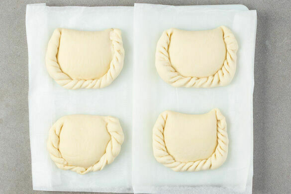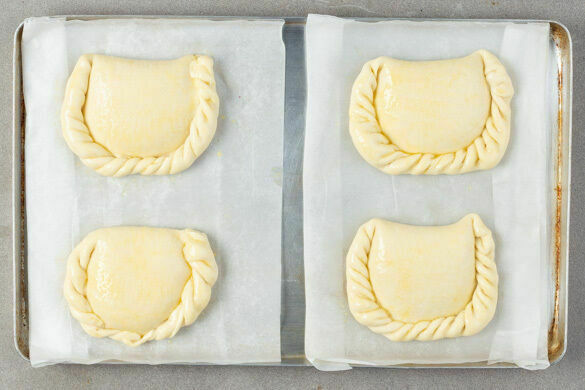 Die Teige mit dem Papier nach unten ausrollen und in je 4 Rechtecke schneiden. Etwa 2EL Füllung jeweils auf einer Hälfte des Rechtecks verteilen, dann die andere Hälfte darüberklappen. Die Ränder entweder dekorativ zusammenfalten oder mit einer Gabel fest verschließen und die Rechtecke zu halbmondförmigen Empanadas formen.