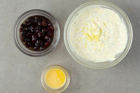 Den Backofen auf 220°C (200°C Umluft) vorheizen. Die Cranberrys in warmem Wasser einweichen. Die Zitronenschale fein abreiben. Die Eier mit einem Schneebesen verquirlen. Den Ricotta mit ca. 3/4 der Eier, 4–5TL Mehl, 2EL Zucker, dem Vanillezucker, dem Mohn und der Zitronenschale zu einer glatten Creme verrühren.
