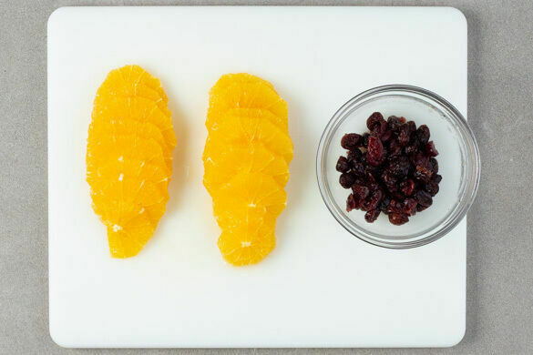 In der Zwischenzeit die Orangen mit einem Messer so schälen, dass auch die weiße Haut entfernt wird. Dann das Fruchtfleisch in dünne Scheiben schneiden und evtl. vorhandene Kerne entfernen. Die Cranberrys durch ein Sieb abgießen.