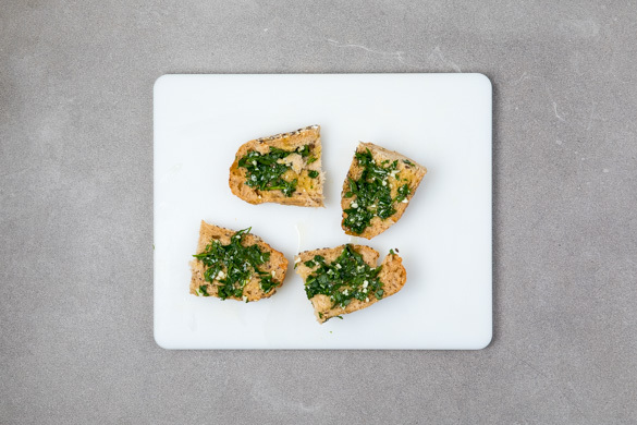 Den Knoblauch schälen und sehr fein würfeln oder durch eine Knoblauchpresse drücken. Die Petersilie samt Stängeln fein hacken. 1–2EL Olivenöl und je 1 Prise Salz und Pfeffer mit dem Knoblauch und der Petersilie verrühren. Das Brötchen halbieren und die Hälften quer teilen. Mit dem Kräuteröl bestreichen und auf einem mit Backpapier ausgelegten Blech im Ofen 7–9Min. backen.