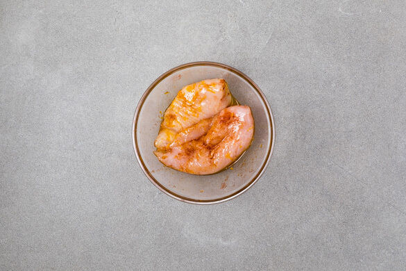 Das Fleisch trocken tupfen und längs halbieren. 2EL Olivenöl, 1–2TL Orangenschale, 1 kräftige Prise Salz und 2TL der Gewürzmischung oder mehr nach Geschmack zu einer Marinade verrühren. Das Fleisch mit der Marinade einreiben und beiseitestellen.