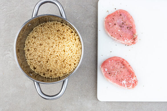 Der Perlencouscous sieht mit seinen kleinen runden Kügelchen nicht nur hübsch aus, sondern hat auch einen feinen, nudelartigen Biss. Wir präsentieren ihn heute mit Petersilie, Gurke und Rosinen zu einem saftigen Schweinerückensteak und leckerem Rote-Bete-Hummus. Geröstete Mandelblättchen dazu – ein Traum!