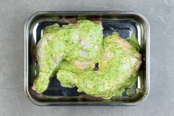 Die Hähnchenschenkel trocken tupfen und die Haut 2–3-mal leicht einritzen, in eine Auflaufform legen und rundherum mit je 1TL Salz und Pfeffer würzen. 3/4 der Mojo auf dem Fleisch verteilen, dann im Ofen 30–35Min. backen, bis das Fleisch gar ist. Etwa 10Min. vor Ende der Garzeit die restliche Mojo auf dem Fleisch verteilen und ggf. ausgetretenen Bratensaft darübergießen.