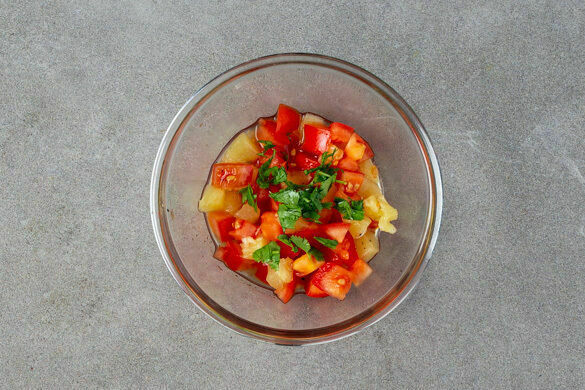 Die Tomaten grob würfeln. Den übrigen Koriander samt Stängeln fein schneiden. Die Tomaten und den Koriander mit der restlichen Ananas und 5EL Ananassaft vermengen und mit je 1/2TL Prise Salz und Pfeffer würzen. Die Hähnchenschenkel mit dem Süßkartoffelpüree, den Bohnen und der Salsa anrichten, den restlichen Oregano darüberstreuen und servieren.