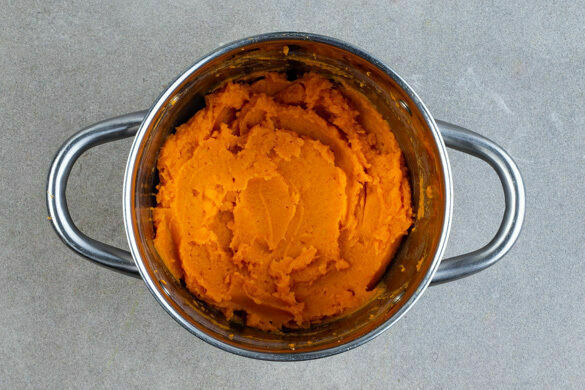 In der Zwischenzeit in einem mittelgroßen Topf ausreichend gesalzenes Wasser für die Süßkartoffeln zum Kochen bringen. Die Süßkartoffeln schälen, in kleine Würfel schneiden und in 10–12Min. weich kochen. Die Süßkartoffeln in ein Sieb abgießen, zurück in den Topf geben und mit 2EL Butter oder Olivenöl zu einem Püree stampfen. Mit je 1/2TL Salz und Pfeffer würzen.
